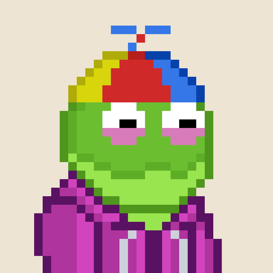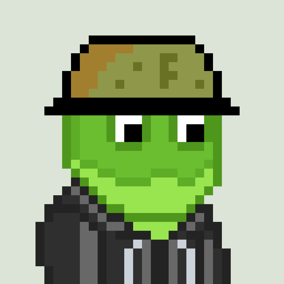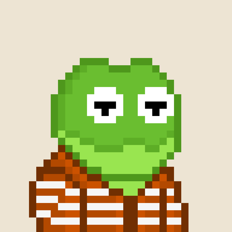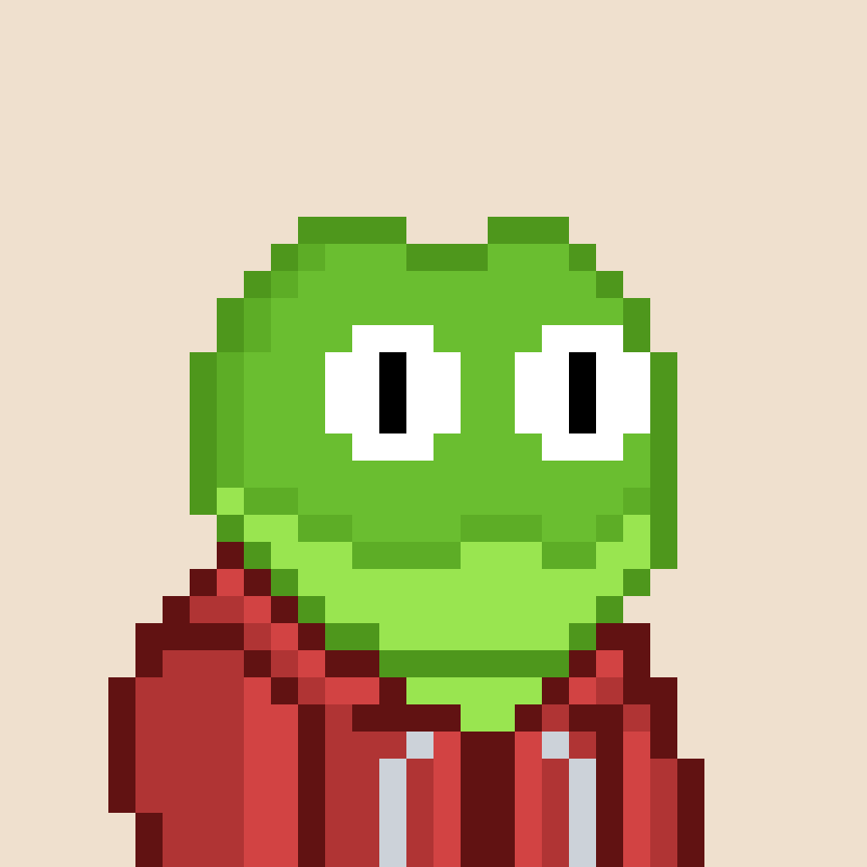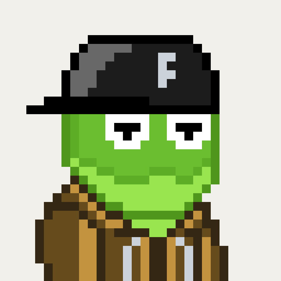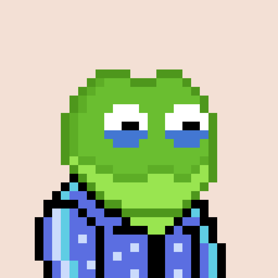Tempo Frogs is a collection of 2,525 unique pixel art frogs living on Tempo. Each frog is algorithmically generated with unique combinations of eyes, clothes, headwear, body, and background traits.
